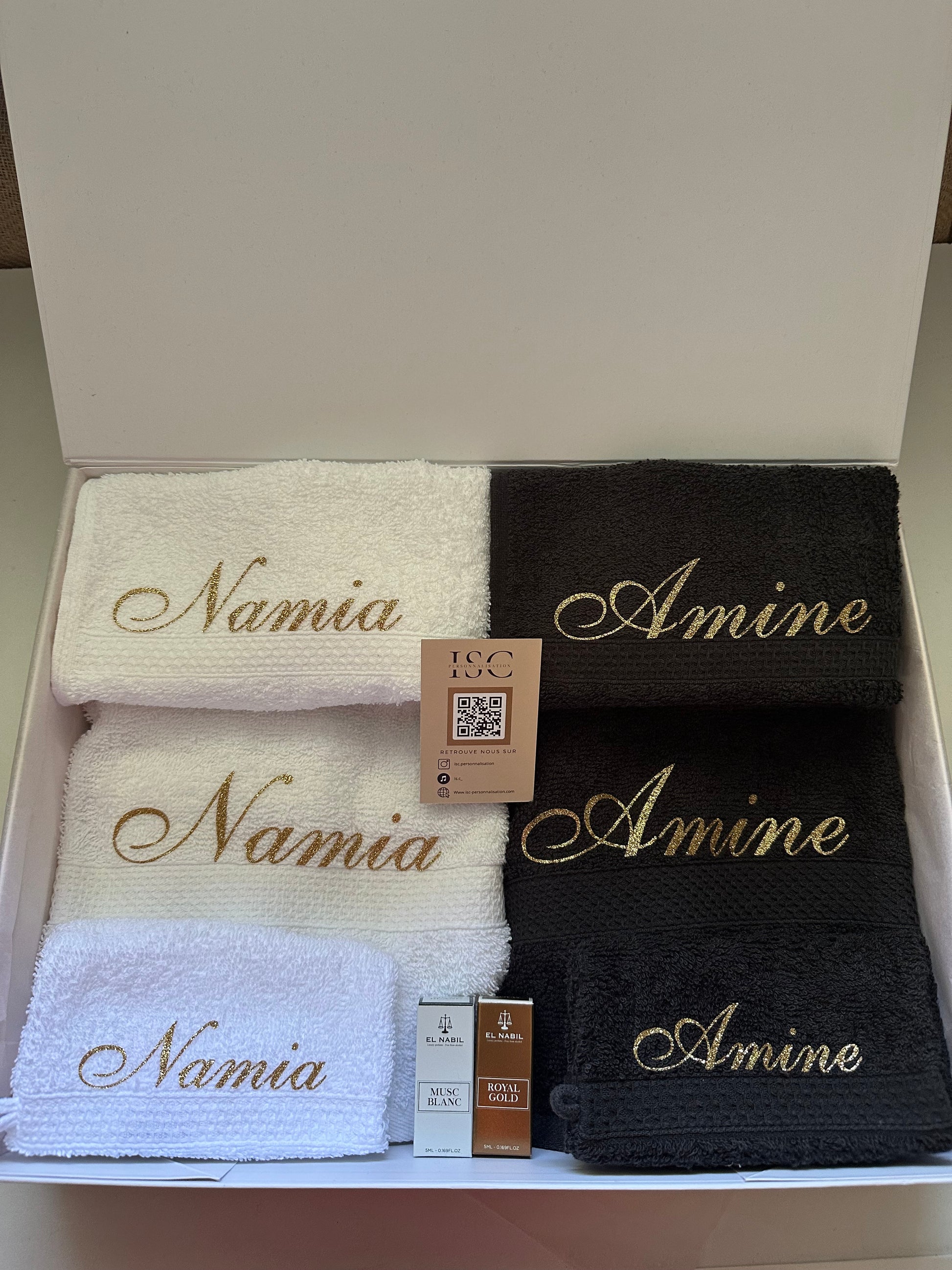 2 serviettes 100*50 // 2 serviettes 50*30 // 2 gants de toilettes // 2 musc El Nabil (5ml)